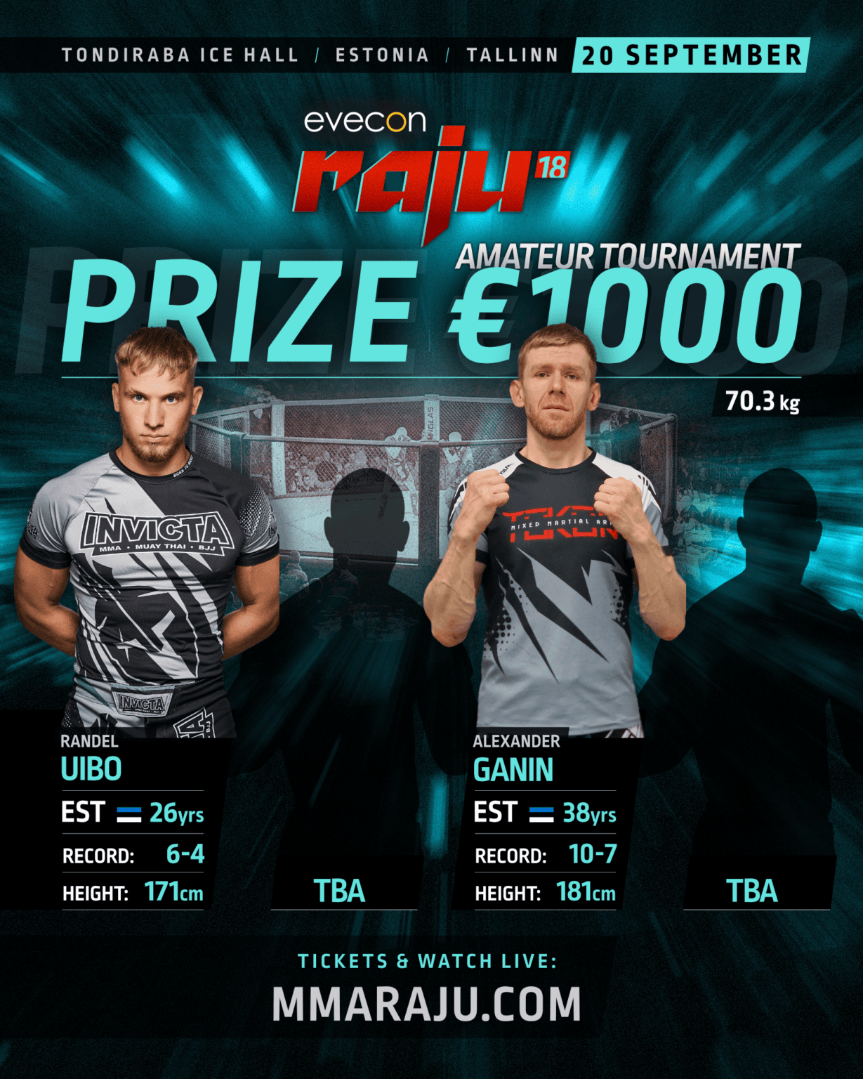 Today, the first amateur fighters were announced who will step into the cage to compete in the €1,000 amateur 4-man tournament at Evecon RAJU 18 – Alexander Ganin (38), from Narva, and Randel Uibo (26), from Sindi near Pärnu, in the 70.3 kg weight class.