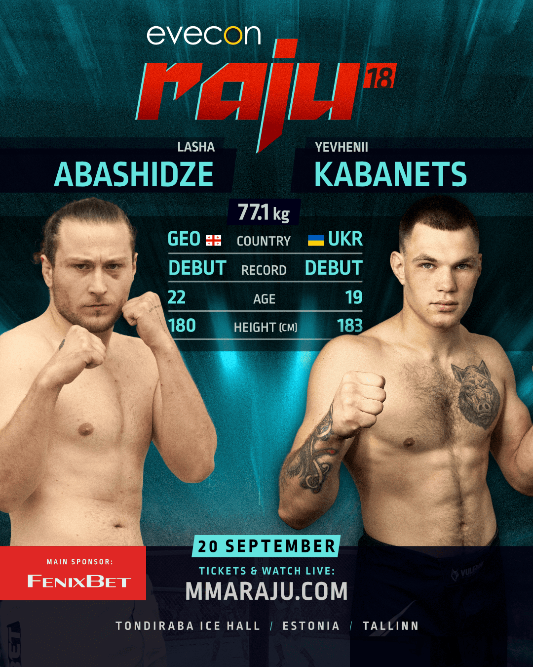 Young Ukrainian talent Yevhenii “The Finisher” Kabanets, who lives and trains in Estonia, will face Georgian fighter Lasha “Zeus” Abashidze at the upcoming Evecon Raju event. Both fighters have proven themselves internationally and will make their professional debuts at RAJU.